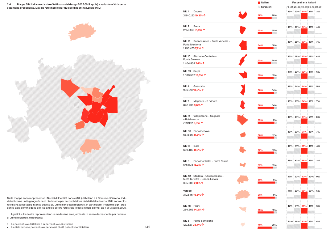 All’interno del Report, l’analisi della mobilità urbana è presentata nel capitolo 2.4 – La città in movimento e si basa sull’integrazione dei dati di rete mobile, introdotta per la prima volta in questa edizione grazie alla partnership scientifica tra Salone del Mobile.Milano e Fastweb + Vodafone.